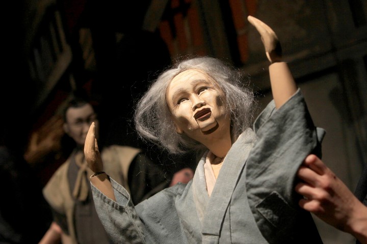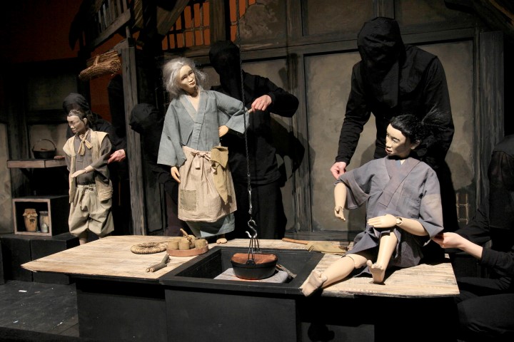 Hasonló helyzetet teremt a bábosok megjelenése: a színészek fekete maszkban és a méhészsapkára emlékeztető fejfedőben játszanak. Bár ez ismét valamelyest a formai hűség jele, de a rengeteg maszkos bácsi és néni néha sokkal érdekesebb, mint a bábok mozgása, sőt, furcsának is érződik, hogy miért kell az arcukat ebben a térben, játékrendszerben és ilyen közelségben eltakarni, hiszen ez nem segíti a bábos absztrahálást, inkább összezavarja. Egyébként Japánban a főmozgató (Omo-zuka) szinte minden esetben vállalja az arcát az előadásokon.